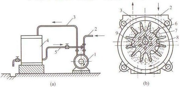 1-真空泵;2-抽氣管;3-排氣管;4-水氣分離箱;5-循環水管;6-葉輪;7-水環;8-進氣孔;9-排氣孔